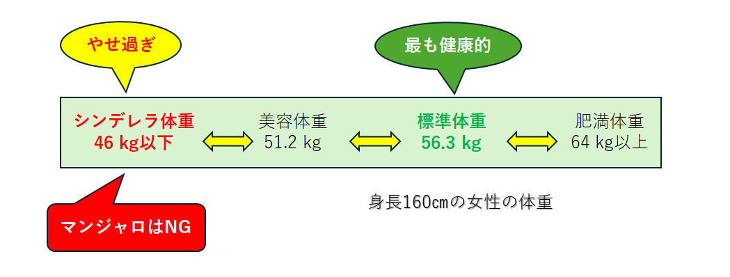 一般的な身長の160㎝の女性では、美容体重といわれる51.2㎏(BMI=20)はまだやせ体型には入らないのですが、シンデレラ体重と言われている45㎏ではBMI=18.0で、やせ体型です。